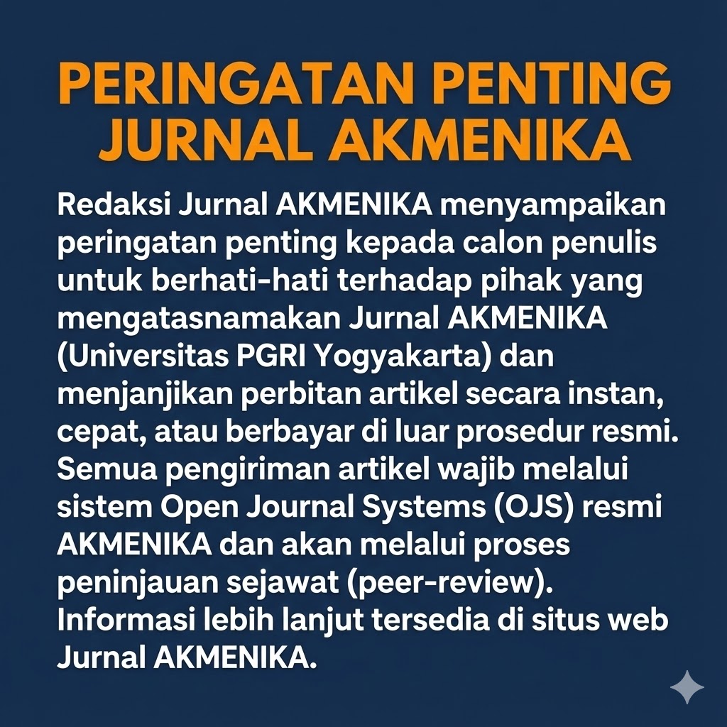 Akmenika is a peer-reviewed journal published twice a year (April and October) by the Universitas PGRI Yogyakarta. Akmenika is published in electronic version (PDF). Electronic articles available at https://journal.upy.ac.id/index.php/akmenika.
